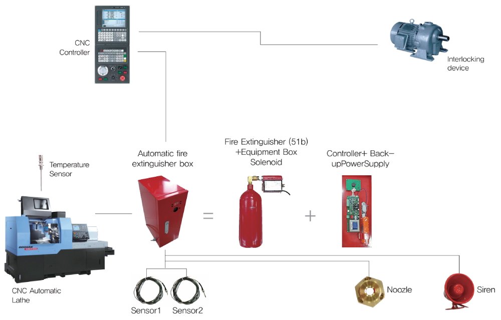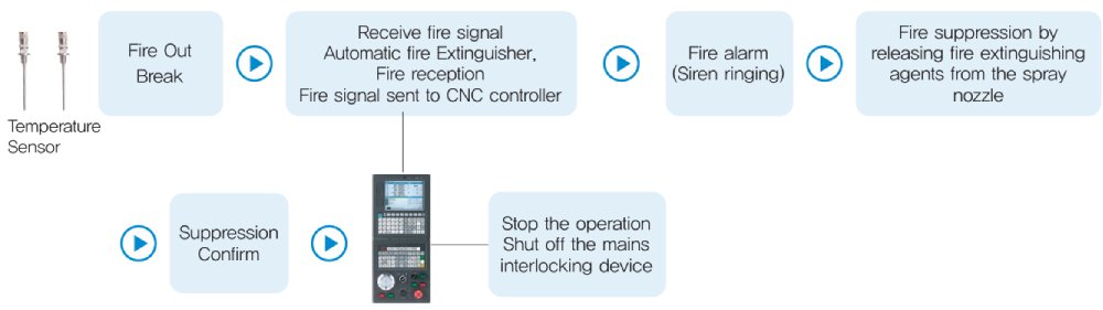 Install temperature sensors at the places of potential fire outbreak. If a sensor detects the temperature going up beyond theset temperature, it transmits a fire signal to automatic fire extinguishing equipment, and the automatic fire If the temperature is detected above the set temperature by installing a temperature sensor in the area where a fire is expected, the automatic fire extinguisher sends a fire signal to the CNC controller on the automatic shelf.