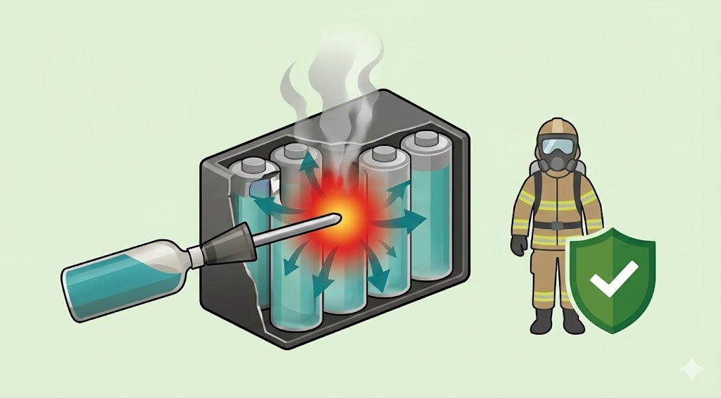 열폭주와 자체 산소 생성으로 인해 폭발과 재발화 위험이 높은 특수 화재입니다.